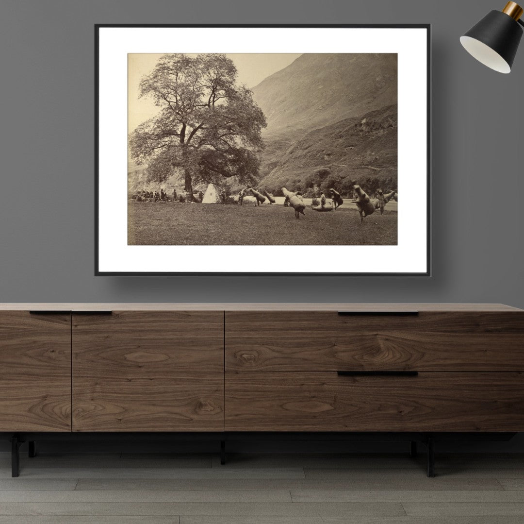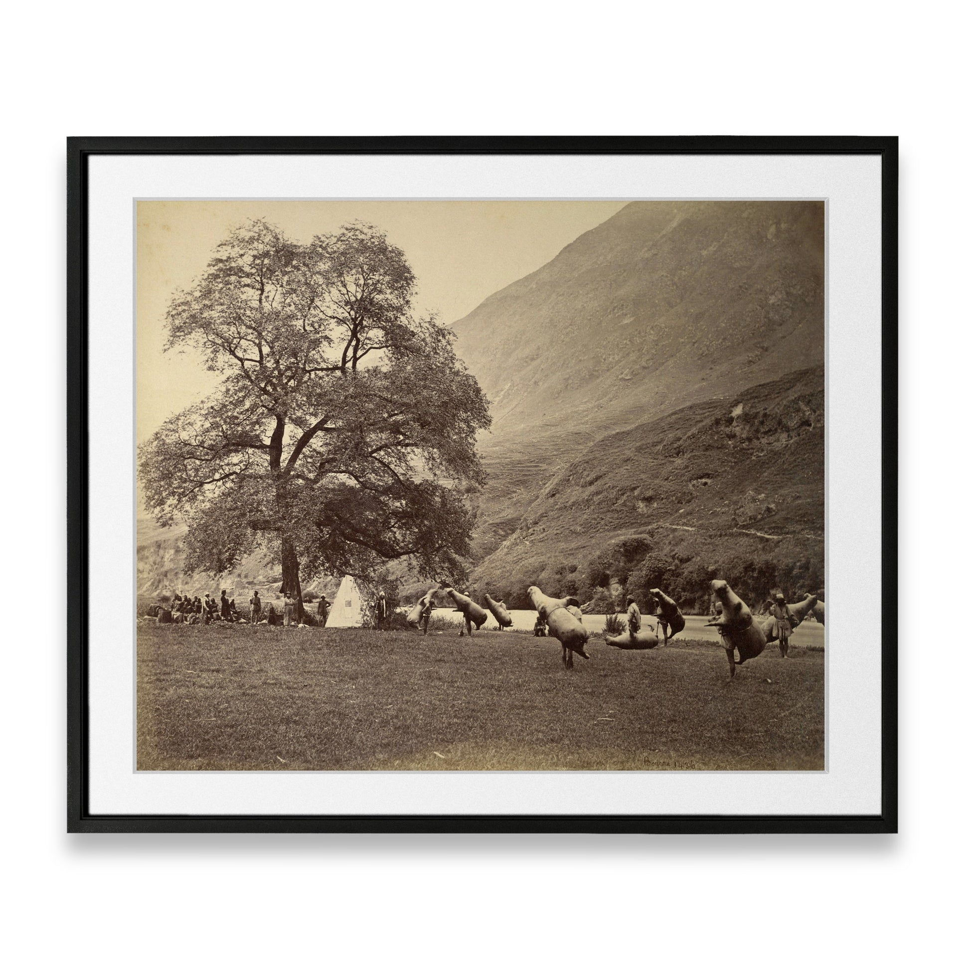 This captivating photograph, captured circa 1865, transports you to the banks of the Beas River in the majestic Kullu Valley. Witness a unique mode of transportation – inflated bullock skins – used to traverse the waters. Printed on premium paper with exceptional clarity, this image offers a glimpse into a bygone era of Himalayan life.