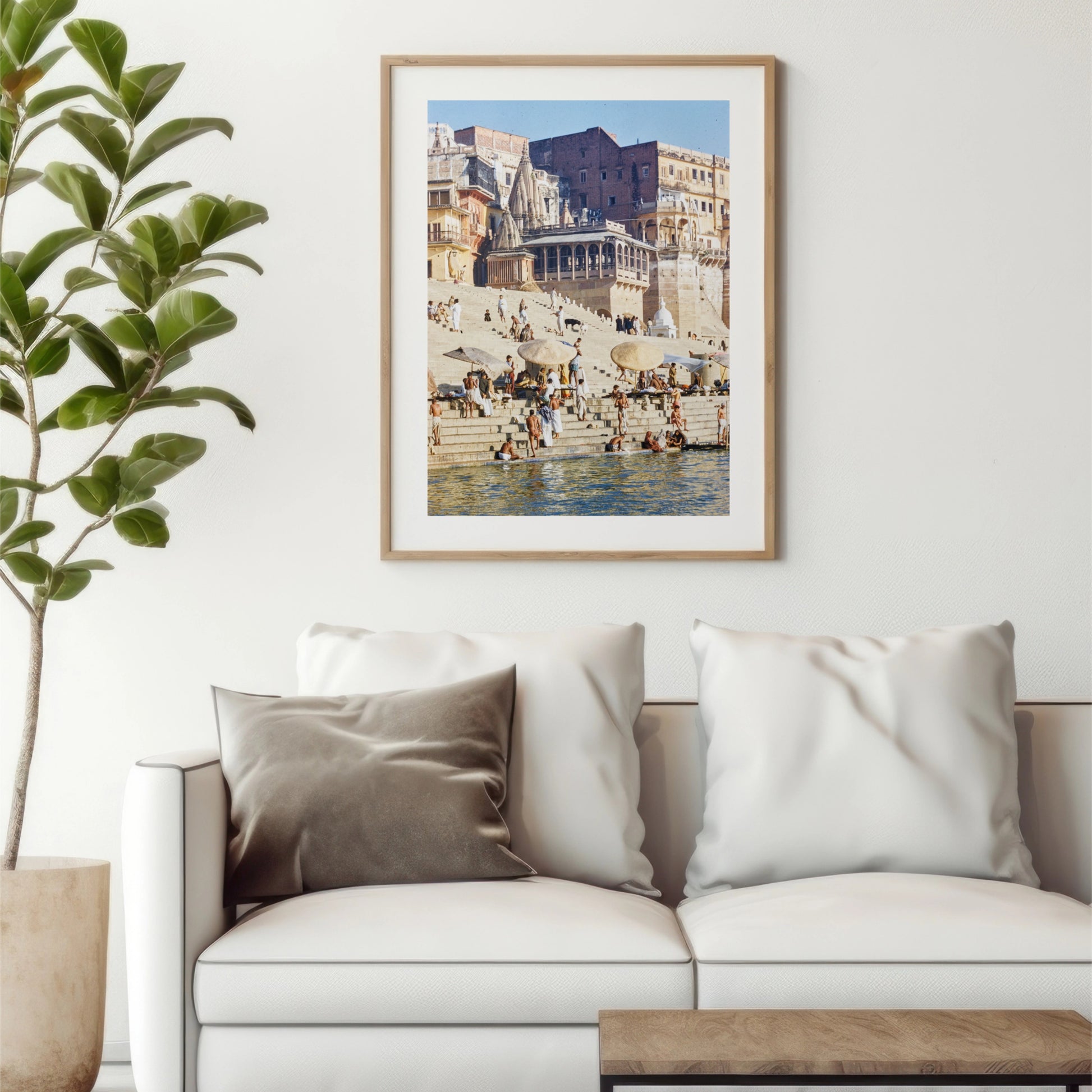 Immerse Yourself in Sacred Tranquility: Step into the spiritual heart of India with the "Ghat of Varanasi - circa 1950" painting. This exquisite artwork captures the timeless essence of Varanasi's ghats along the sacred Ganges River, showcasing the serene beauty and profound spiritual atmosphere that have drawn pilgrims and seekers for centuries.