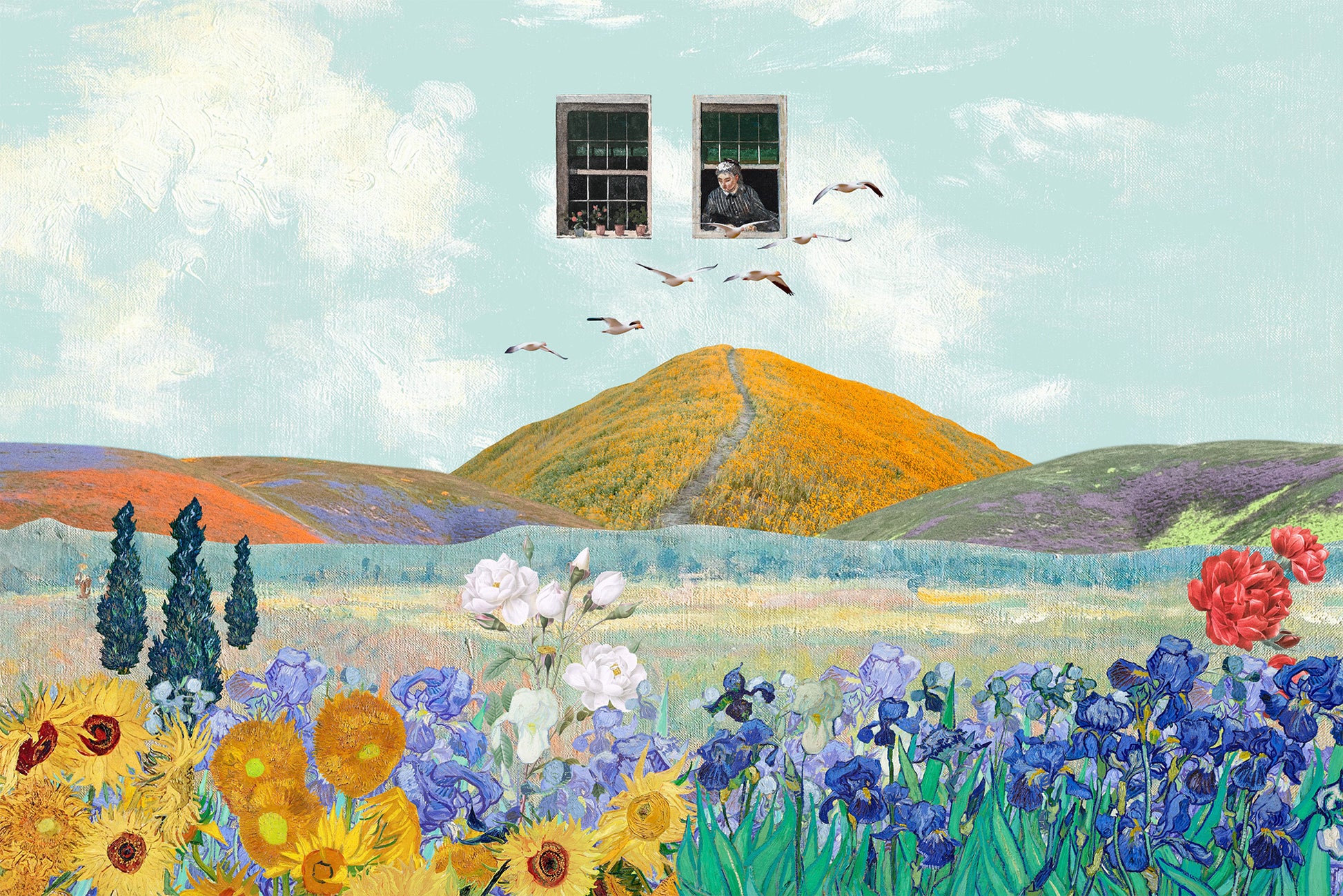 Transport yourself to a realm of vibrant hues and swirling brushstrokes with 'Inside the Mind of Van Gogh'. Embrace the timeless beauty of sunflowers, irises, and the whimsy of birds in this captivating visual escape. Elevate your space with a touch of artistic brilliance.