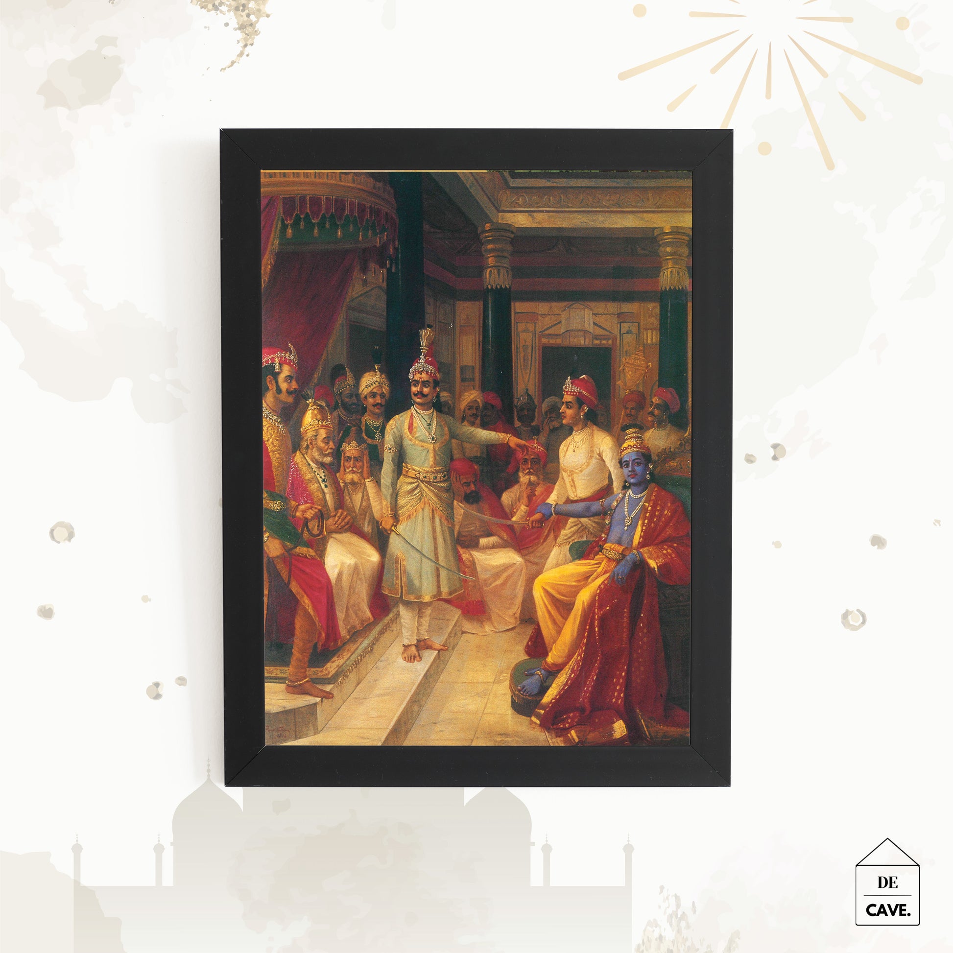 "Krishna Shishtai" or "Krishna as an Envoy" is a masterpiece by Raja Ravi Varma depicting the divine figure of Lord Krishna. In this painting, Krishna is portrayed as a messenger, radiating with divine grace and charm. He stands tall, adorned in royal attire, symbolizing his role as a diplomat in the epic Mahabharata. With his serene countenance and captivating presence, Krishna embodies the essence of diplomacy and wisdom. Through vibrant colors and meticulous detailing, Raja Ravi Varma captures the timeless allure of Krishna's character, inviting viewers into the enchanting world of Hindu mythology and spirituality.