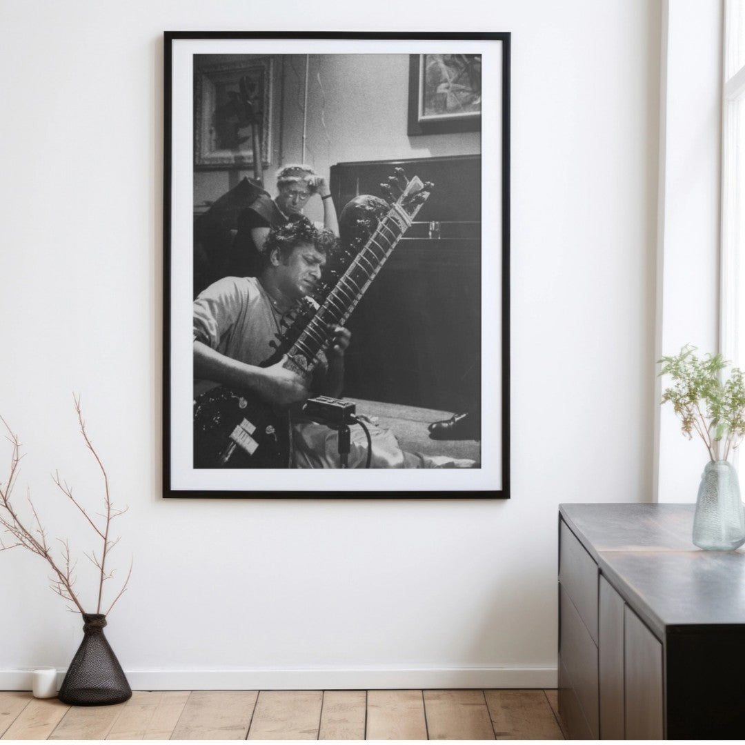 This photograph is more than just a picture; it's a testament to the artist's dedication to introducing the world to the beauty and complexity of Indian classical music. Shankar's captivating stage presence and the intricate details of his sitar are sure to mesmerize any viewer.