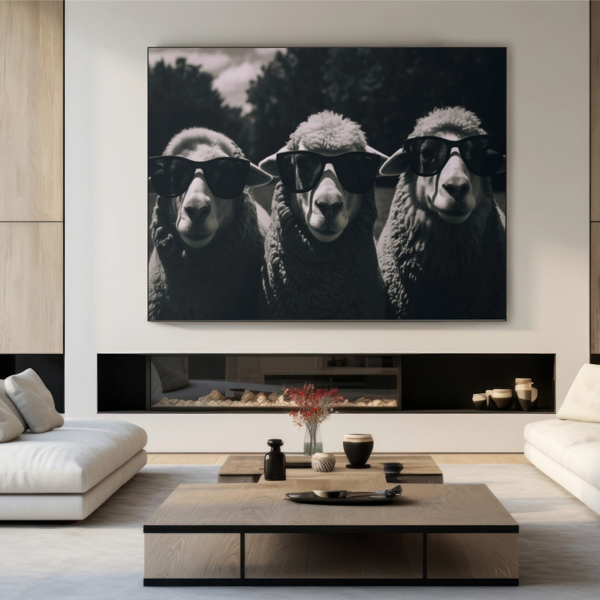 Capture Whimsical Moments: Enjoy the playful charm of this photograph featuring sheep strolling through a garden, with one sheep standing out sporting stylish sunglasses. This whimsical scene adds a touch of humor and personality to any space.