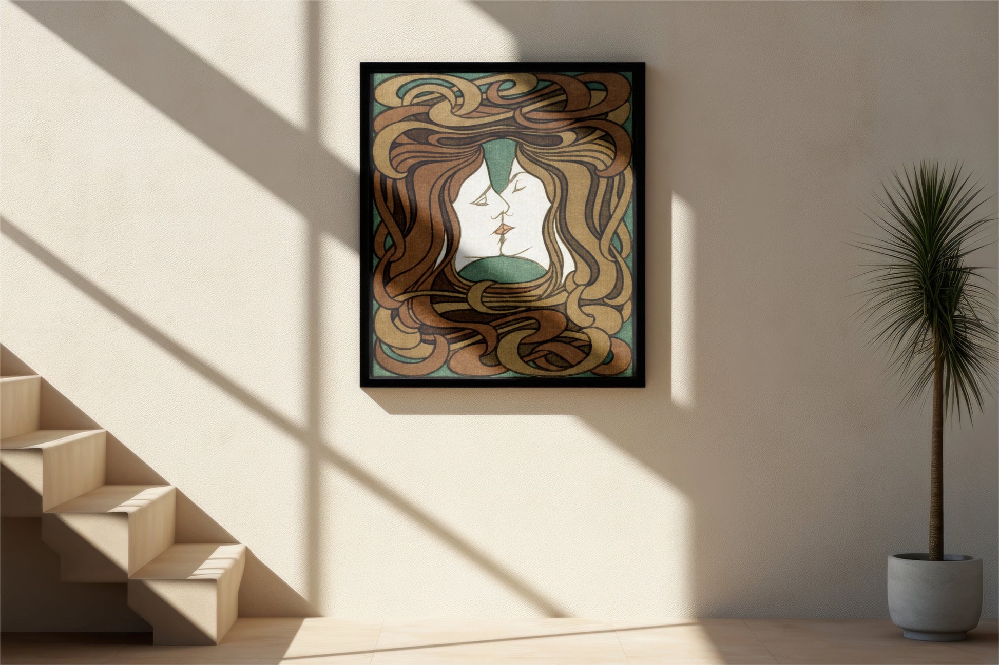 The Kiss (1898) by Peter Behrens" captures a timeless moment of passion and intimacy through the artist's skillful use of form and emotion. Behrens, a pioneer of modern design, imbues this iconic piece with a sense of romanticism and sensuality that resonates with viewers across generations. The lovers' embrace is depicted with a delicate balance of tenderness and fervor, their bodies entwined in a graceful dance of affection. Behrens' mastery of line and composition lends the artwork a sense of timelessness, making "The Kiss" a captivating expression of love's enduring power. This evocative masterpiece continues to enchant audiences with its beauty and emotional depth, inviting viewers to experience the eternal allure of human connection.